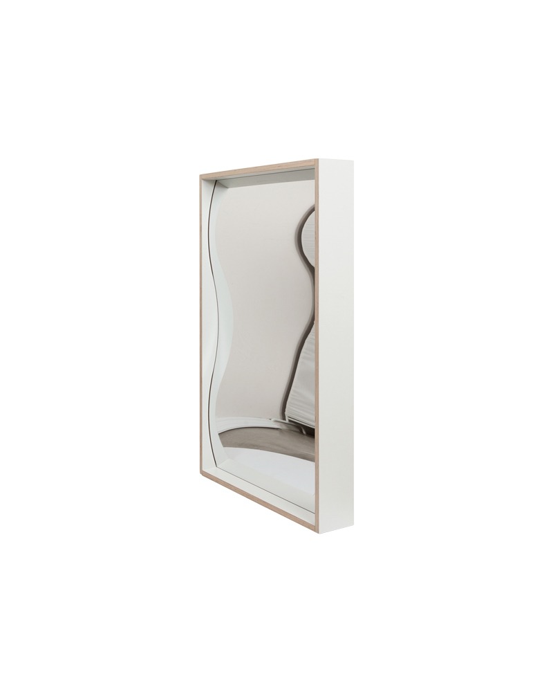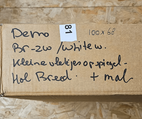 Oud-demo model lachspiegel 100x68cm, in twee kleuren uitgevoerd. De ene kant bruin-zwart en de andere kant white wash. Op de spiegel bevindt zich een beetje patina, maar dit is niet hinderlijk. Deze spiegel heeft nog een houten achterzijde.